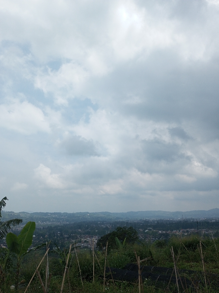 The image depicts a panoramic view of the city of Vieng Phouka, Laos, from an elevated vantage point. The foreground features a steep, vegetated slope with dense green foliage, including broad-leaf plants, grasses, and several thin, vertical bamboo or wooden stakes supporting unknown growth. Dark ground cover or netting is visible on the right side of this slope. In the midground, the city spreads across a valley, characterized by numerous buildings and interspersed trees and green spaces, suggesting a mix of urban and semi-rural development within a hilly terrain. The background reveals multiple layers of rolling hills and distant mountains, partially obscured by atmospheric haze. The sky is overcast with a mix of light grey and white clouds, with a brighter area in the upper right quadrant. No people, animals, or specific actions are discernible in the scene.