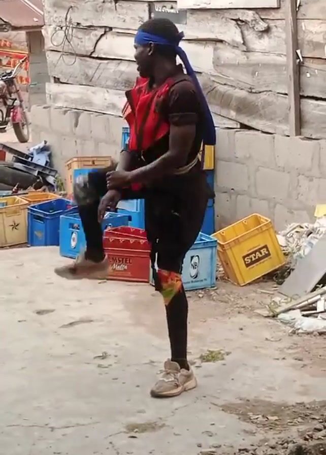 A man wearing a blue headband, dark shirt with red and black accents, dark pants, and tan sneakers is performing gymnastic moves on a concrete surface. He balances on one leg while holding the other leg up to his head, then shifts into a backward roll, using his hands for support. He regains his footing and continues moving. The background includes a wall constructed of wooden planks and concrete blocks, a red motorcycle with a yellow seat, and stacks of blue and yellow plastic crates. Trash litters the ground.