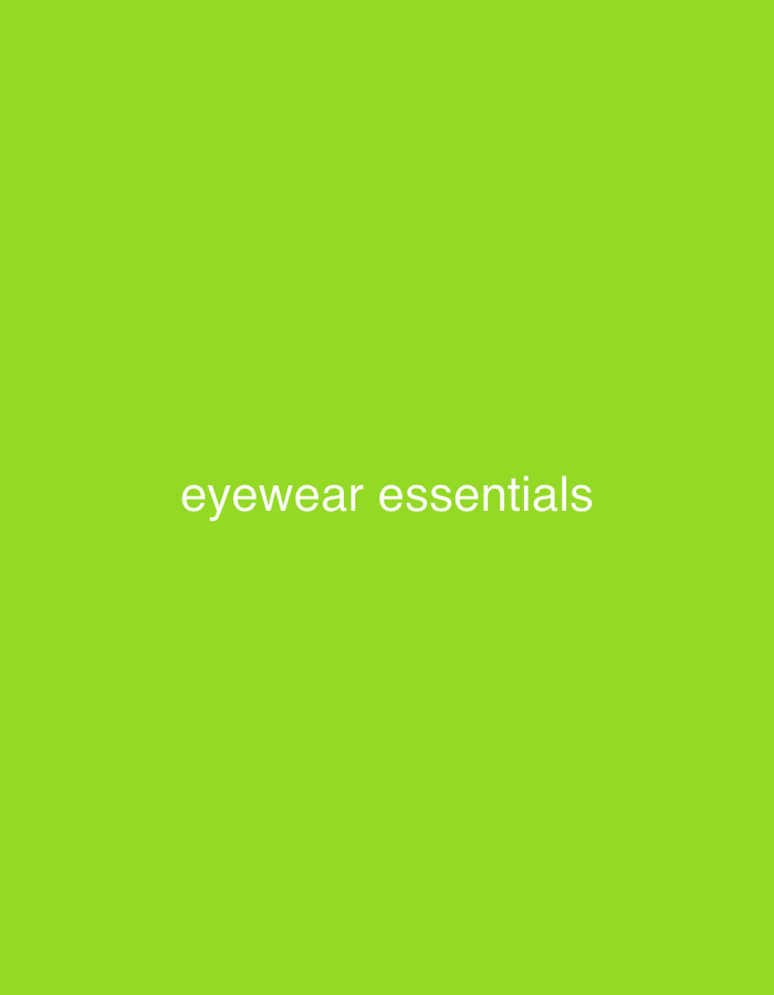 The image displays white, sans-serif text reading "eyewear essentials" centrally aligned against a solid, vibrant lime green background (color approximate hex #7FFF00)