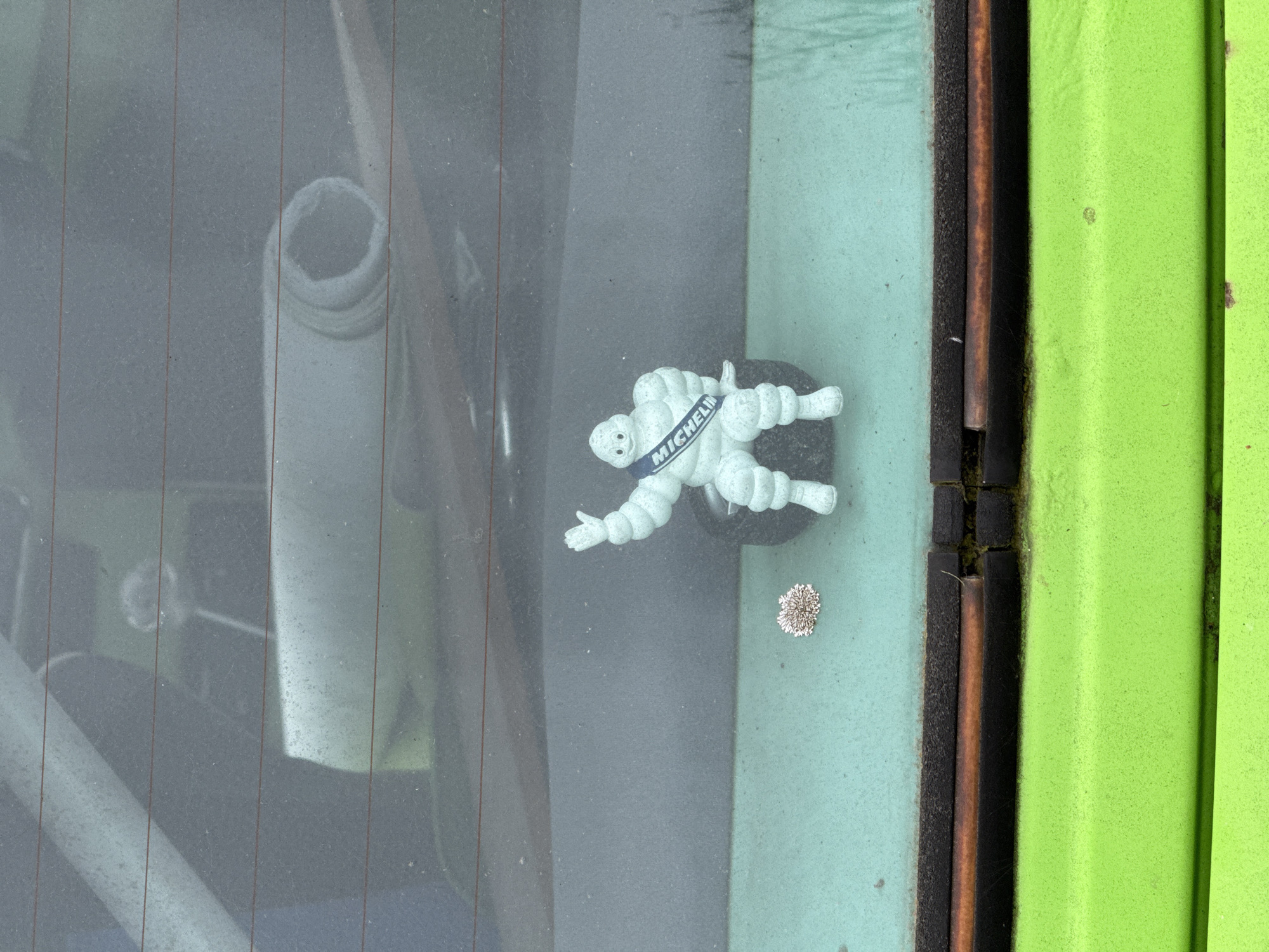 The image displays a white Michelin Man (Bibendum) figurine, located inside a vehicle, viewed through a dirty rear window in Hertsmere, United Kingdom