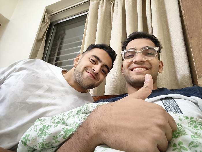 Two smiling men pose closely for a selfie. The man on the right wears clear-framed glasses and gives a thumbs-up. Both appear relaxed, possibly in bed, covered by a green and white patterned blanket. Neutral curtains backdrop the scene, partially obscuring a window with horizontal blinds. The setting feels casual and intimate.
