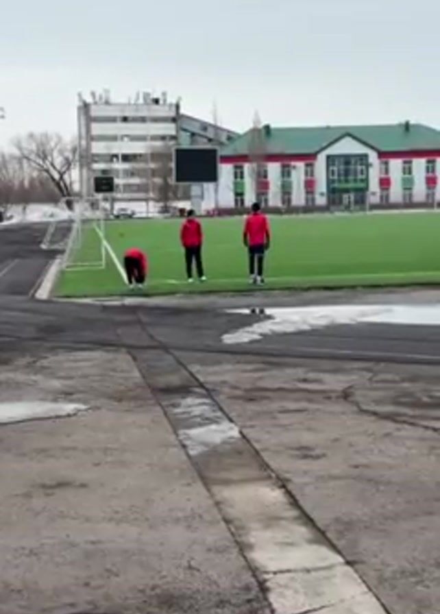 concrete area next to an artificial turf soccer field on an overcast day. In the distance, three people in matching pink tracksuits are on the field. One person is bent over near a goal post, possibly picking something up, while the other two are standing and looking in the same direction. A building with a large screen on the side is behind them, and another green and red building is visible on the right. Patches of snow are scattered around the concrete area.
