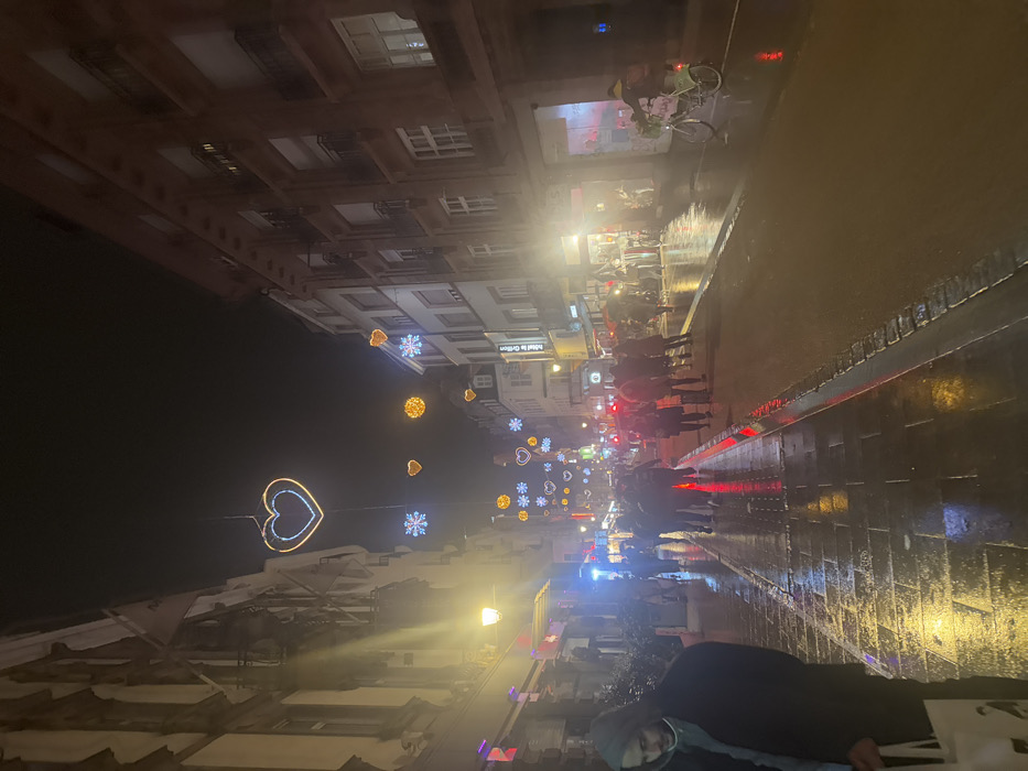 A nighttime street scene is captured from a tilted perspective. Rain-slicked cobblestones reflect city lights and red taillights. Buildings line the street, adorned with heart-shaped and snowflake-shaped light decorations. People walk along the sidewalk, their figures slightly blurred. A person wearing a hooded jacket sits on the bottom of the frame. The overall atmosphere is urban and festive despite the wet weather.