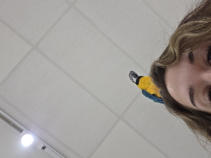 The image depicts an indoor scene in Eeklo, Belgium. A Blue-and-yellow Macaw is perched on the crown of a person's head. The parrot's plumage is predominantly yellow on the chest and abdomen, and blue on the back and wings. Its head is slightly turned towards the upper right of the frame, with its dark beak visible. The person's upper forehead, eyebrows, and eyes are visible, framed by light brown, wavy hair, and the eyes are directed towards the viewer. The background consists of a white suspended ceiling with a visible grid pattern of acoustic tiles. A bright, circular white light fixture is present in the upper left quadrant of the ceiling, adjacent to a linear track fixture.
