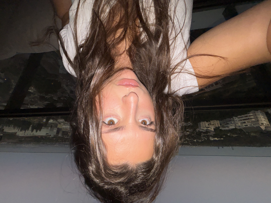 The image displays a female subject in a close-up self-portrait, oriented vertically (rotated 90 degrees counter-clockwise)