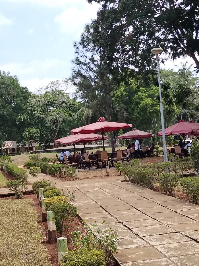 A park setting features a paved pathway with manicured hedges on either side. Red umbrellas shade tables and chairs occupied by people. A light post stands tall amidst lush green trees and foliage. Buildings are visible in the background. The sky is partly cloudy. The scene evokes a relaxed, outdoor dining atmosphere.