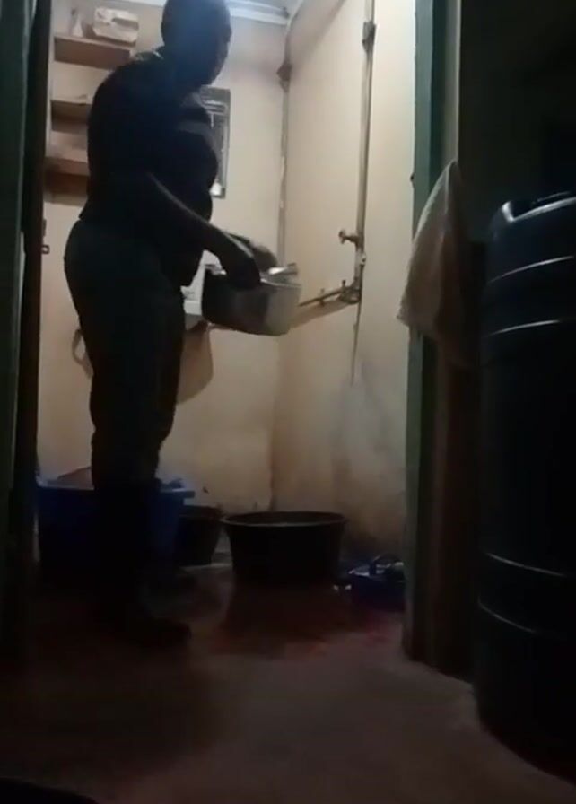 A person wearing dark clothing and shoes is standing in a poorly lit room. They are holding a silver pot and pouring liquid into a sink. Several tubs are on the floor. A water storage container sits to the right, near a doorway. A towel hangs on the wall next to the container.