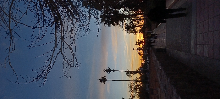 A sideways view captures a serene sunset sky, transitioning from blue to orange hues above a line of palm trees and streetlights. Silhouetted figures walk along a tiled pathway, bordered by a low wall. Bare tree branches frame the left side of the image against the evening sky.