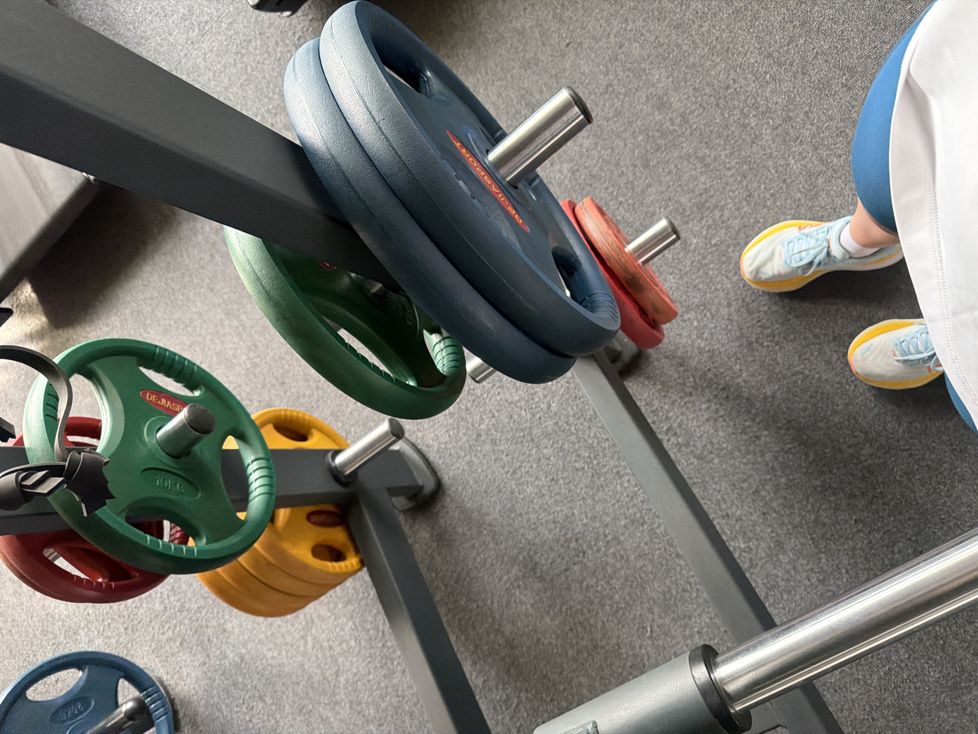 weight rack loaded with various weight plates of different colors (blue, green, red, and yellow). The rack is gray metal. A person wearing blue leggings, a white top, and white and yellow running shoes is standing near the weight rack. The scene appears to be indoors, likely in a gym. There is no information available in this image to determine the location as Hrodna, Belarus.