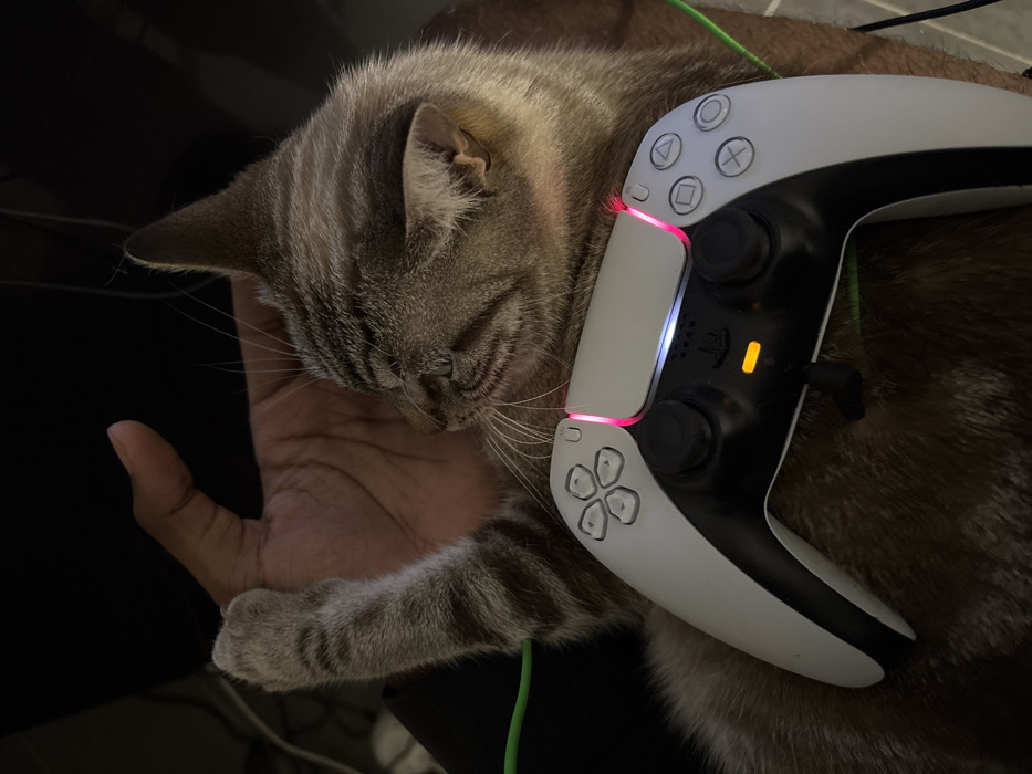 A domestic short-haired cat with grey and brown tabby markings is depicted in a close-up, resting with closed eyes, in an indoor setting in Saint-Denis, France. Its head is cradled by a dark-skinned human hand. One of the cat's paws rests on the human's wrist. A white and black PlayStation 5 DualSense controller is positioned on the cat's body, displaying illuminated pink/red light on its light bar and an orange indicator light near the PlayStation button. A green cable is visible to the left of the controller and the cat's side. The background is dark and out of focus.