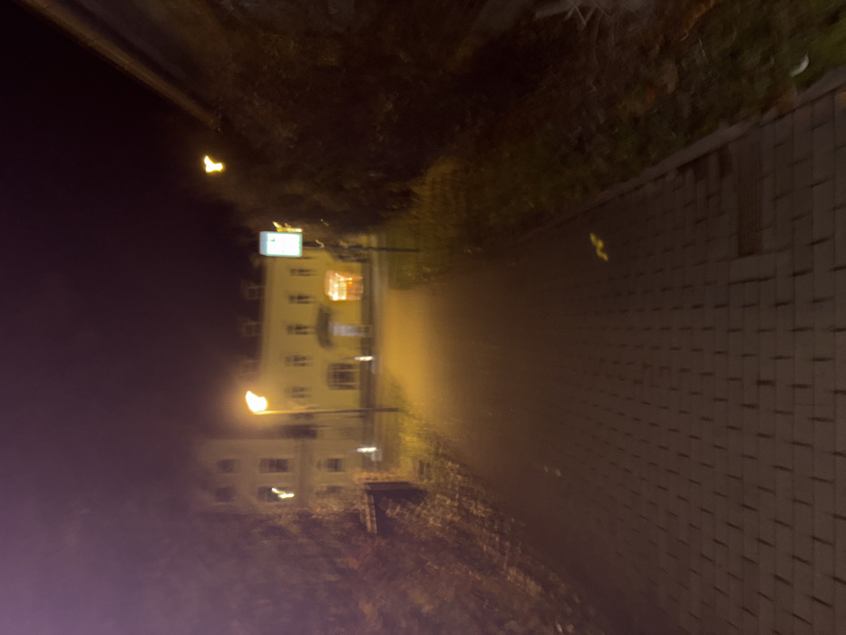 At night, a blurry photo shows a multi-story building illuminated with lights from street lamps and windows. A street with a tiled surface stretches towards the viewer, and vegetation lines the side of the road. The overall image has a dark and somewhat distorted appearance due to motion blur.