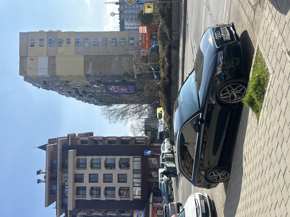 The image depicts a bright daytime urban street scene in Sofia, Bulgaria. In the foreground, a black Audi A4 Avant, bearing Bulgarian license plate "CB 9800 ME," is parked facing right on a paved sidewalk. A small square of grass is visible directly in front of its left front wheel. Partially visible behind the Audi is a white Opel Corsa with license plate "CB 0278 AK." To the left, a modern, multi-story building with a brown and beige facade and numerous arched windows and small balconies rises. A decorative spire crowns its roof. Adjacent to this building's base, a street with several parked and moving vehicles, including a yellow van, is visible. A pedestrian is discernible near a cluster of large green refuse containers. Further down the street, on the right side of the image, stands a tall, older apartment building characterized by a faded yellow and grey exterior with visible signs of wear, patches, and external air conditioning units. A large purple billboard is positioned between the modern and older buildings. An area with bare trees and dense, low-lying brown shrubbery acts as a median separating traffic lanes. Beyond this, a small commercial structure with an orange awning, labeled "ЗАСТРАХОВКИ" (Insurances), and a "BILLA" supermarket sign are visible. The sky is clear and blue with minimal cloud cover, and strong sunlight casts distinct shadows across the scene.