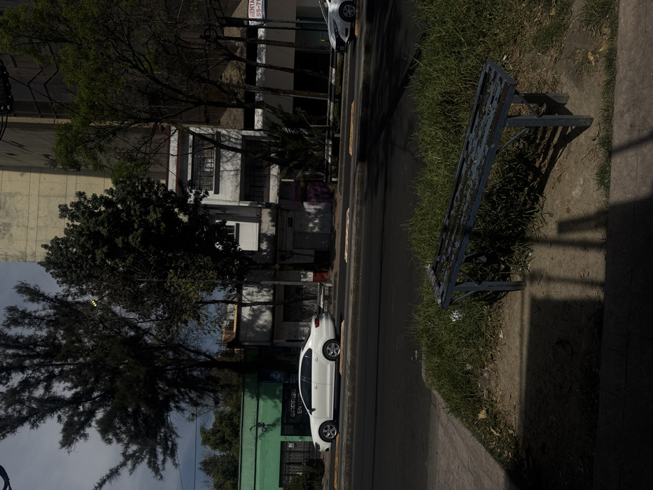 The image displays an urban street scene in Mexico City, Mexico, under natural daylight conditions, characterized by prominent shadows. In the foreground, a rectangular, weathered blue metal bench with peeling paint rests on a patch of unkempt grass adjacent to a concrete sidewalk. The midground features a two-lane asphalt road. A white sedan, identifiable as a Volkswagen Jetta, is positioned on the far side of the road, appearing either parked or moving slowly toward the right. A partial view of a second white vehicle is visible further right on the same side of the road. Yellow painted lines are present on the far side of the roadway. The background consists of a row of buildings and dense tree foliage. From left to right, visible structures include: a bright green building with a dark entryway and a sign reading "GARAGE EN"; a multi-story white building featuring multiple windows and dark metal gates; a taller, light-colored building with a textured facade; and another building on the far right with dark windows, displaying a partially visible "RENTA 55-79..." sign. Numerous trees with dark green foliage are scattered throughout the background. The sky is partially overcast. No individuals are present in the scene.