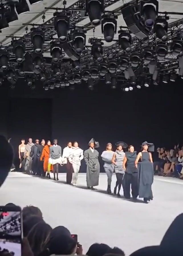 A crowd of people watches as a line of models walk down a runway. Many in the crowd hold up phones. The models wear an assortment of outfits, many of which are earth tones, grey, or black. Overhead are many rows of lights and speakers. There are empty black areas behind the models, and people seated to the right of them.