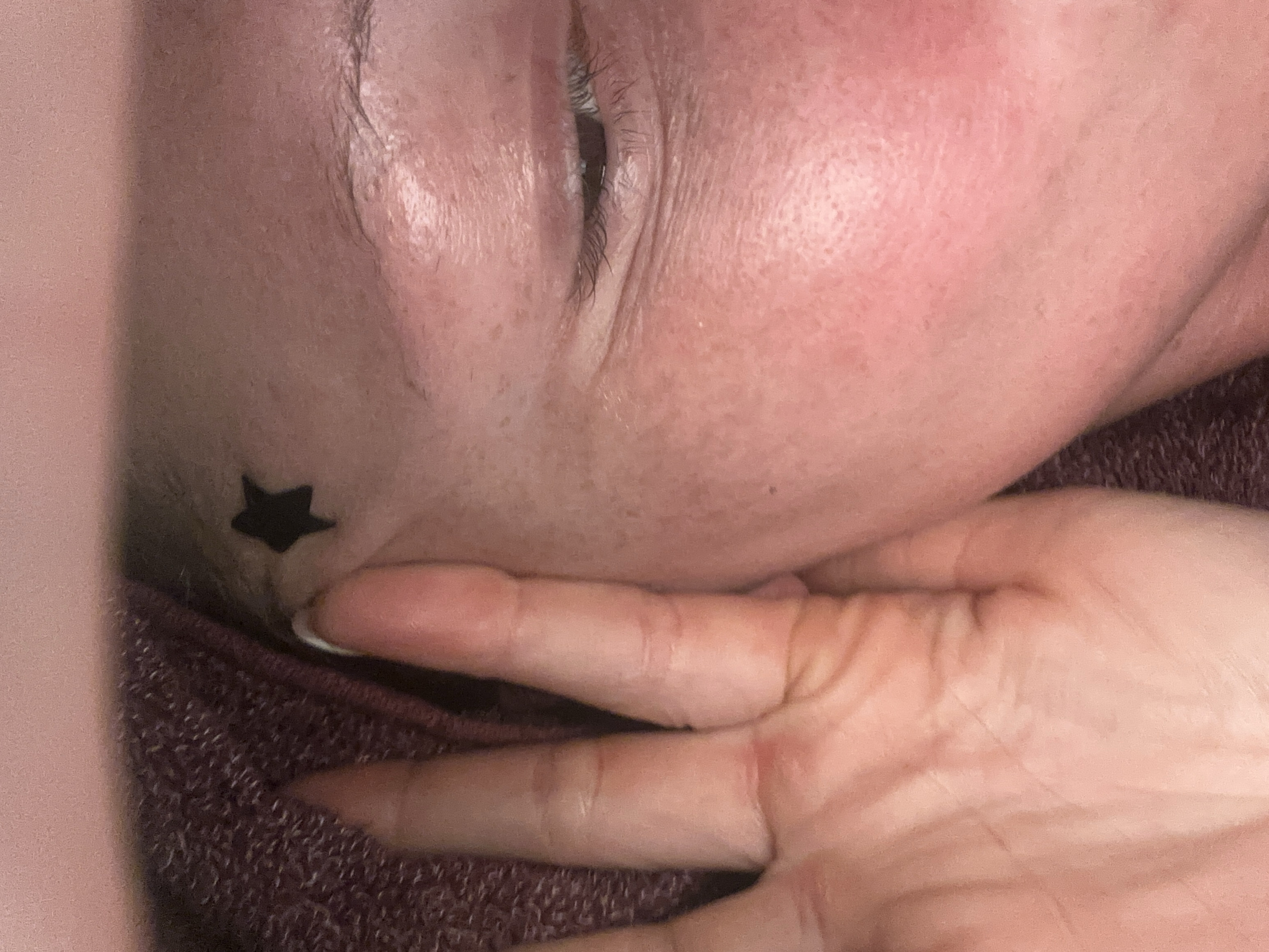 A close-up image features a person's face, cheek pressed against their hand. The person's eye is partially closed. A small, black star is visible on the side of their face, near the jawline. The skin appears somewhat red and textured. The hand is in the foreground, with the fingers slightly curled. A maroon-colored textured material is visible underneath the hand and cheek.