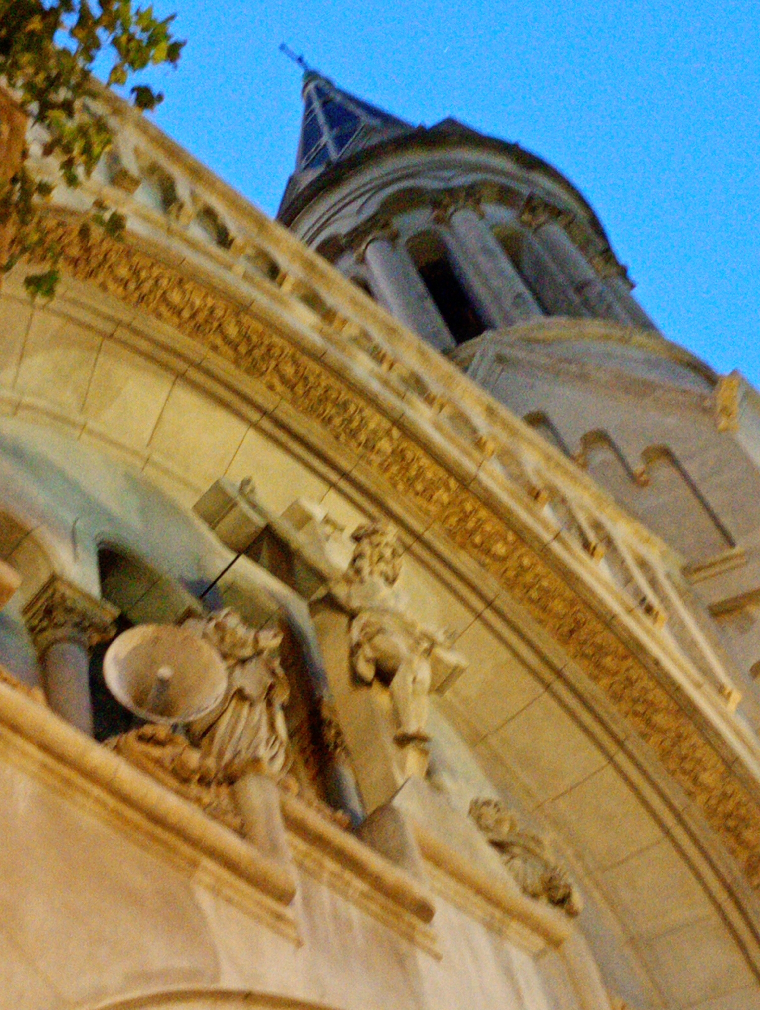 close-up, upward view of architectural details from the facade of a building, likely a church, against a blue sky. The architectural elements are constructed of light-colored stone and adorned with decorative carvings, including figures and ornate patterns. A small portion of a tree with green leaves is visible in the upper left corner. The style of the architecture suggests a historical European influence, and the location is indicated to be in the city of Buenos Aires, Argentina.