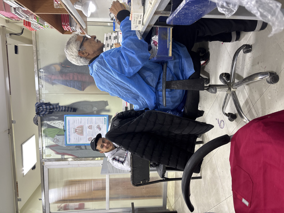 The image depicts an interior scene of a dental laboratory or workshop in Fez, Morocco, with two men engaged in activities. In the foreground and to the right, an elderly man with white hair, a grey mustache, and glasses is seated at a metal-framed desk. He wears a disposable blue smock over dark trousers and is focused on meticulously working with small dental models or prosthetics using hand tools. An adjustable white task lamp provides illumination to his workspace. The desk surface contains various tools and materials, and an open blue drawer reveals small components. Above his desk, wooden shelves are stacked with numerous small boxes, likely containing dental supplies. He is seated on a dark office chair with a chrome five-wheel base. To the left, a younger man with dark hair and a clean-shaven face is seated at another desk, smiling directly at the camera. He wears a white hooded sweatshirt with dark stripes on the sleeves and a black baseball cap featuring a white Nike logo. A black quilted puffer jacket is draped over the back of his chair. The background features a light-colored wall. A poster titled "Protégez notre santé Bucco-Dentaire!" (Protect our Oral Health!) with an elmex logo is affixed to the wall, illustrating dental anatomy. Various garments are hanging on hooks behind the poster. A translucent, possibly corrugated plastic, partition is visible on the far left. Overhead, rectangular fluorescent light panels are recessed into the ceiling. The floor is covered with light-colored tiles. In the immediate foreground, a black chair arm is visible, along with a folded red garment, possibly medical scrubs, draped over a chair. A small purple circular object lies on the tiled floor between the chairs.