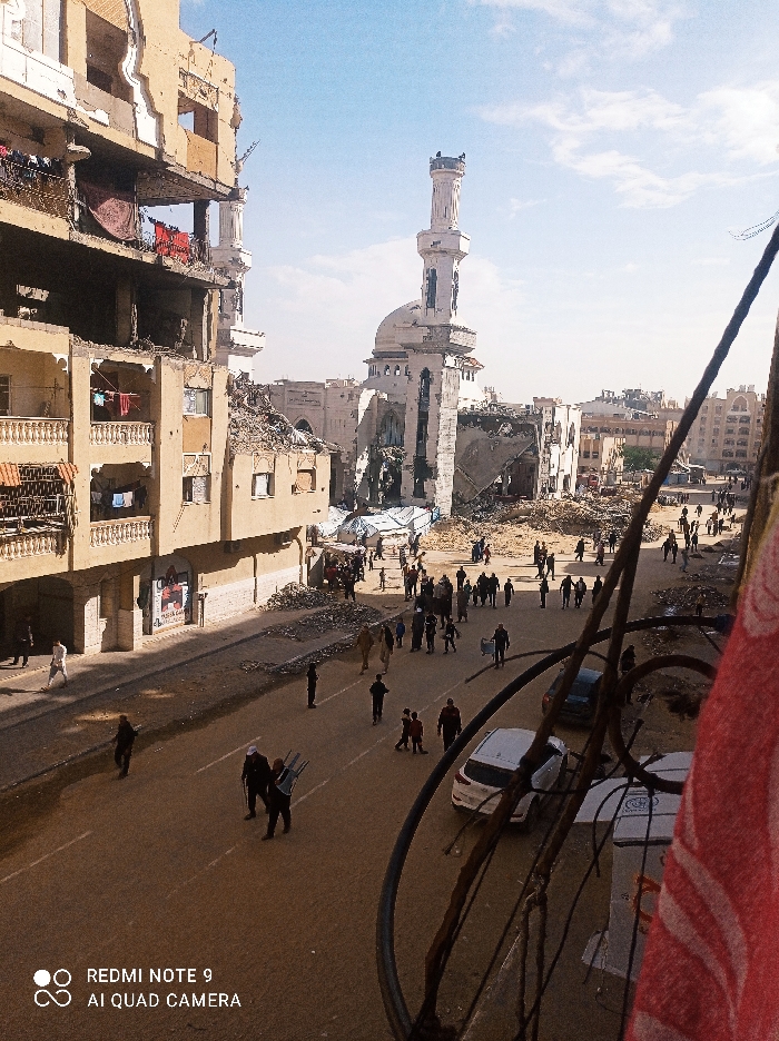 - "An elevated view captures a heavily damaged urban street scene in Khan Yunis, Palestinian Territory, centered on the significantly damaged Great Mosque of Khan Yunis" by FM-iymI62, licensed under CC BY 4.0