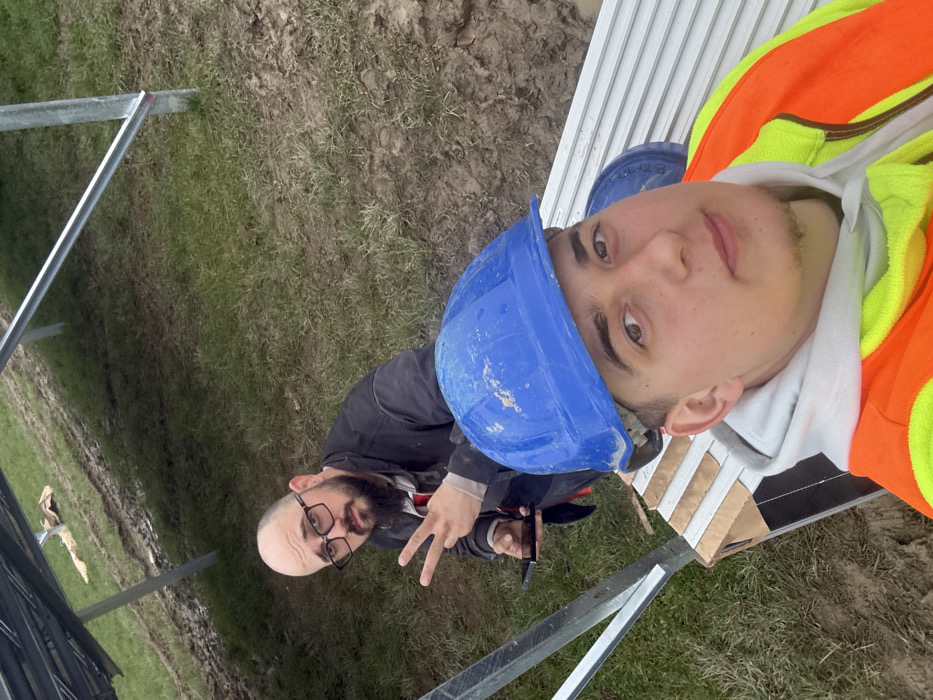 This image, taken at Baldurgan Hill, Ireland, depicts two males at a solar panel installation site. In the foreground, a young adult male with fair skin, dark hair, and a slight goatee is shown from the chest up, looking directly at the camera. He wears a dirty blue hard hat, a white hoodie, and an orange and yellow high-visibility vest. Behind him and to his left, an adult male with a bald crown, dark beard, and glasses looks towards the camera, holding a dark smartphone in his right hand and forming a peace sign with his left hand. He wears a dark jacket or shirt over a lighter garment. The men are positioned amidst metal racking structures, likely supports for solar panels, some of which are visible. The ground consists of disturbed earth, mud, and sparse green grass. The overall environment suggests an active outdoor construction or energy development site.