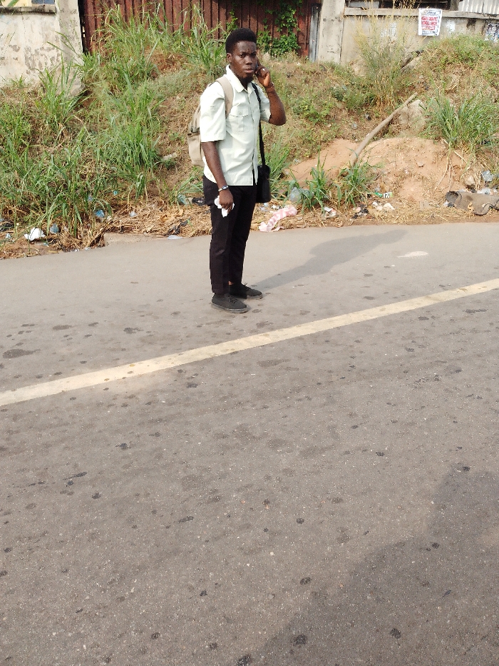 A young adult male stands on an asphalt road in Irete, Nigeria, facing slightly left from the camera's perspective