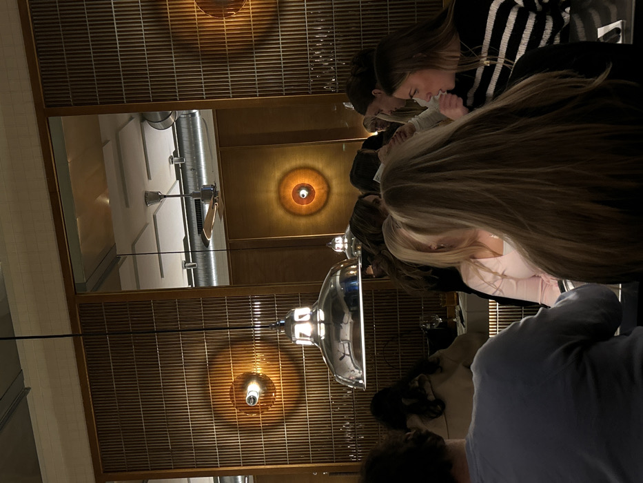 The image depicts the interior of a contemporary restaurant or bar in Paris, France, at what appears to be evening or night due to the reliance on artificial lighting. The establishment features warm, ambient lighting from multiple sources. A large, prominent industrial-style metallic pendant lamp hangs centrally in the mid-foreground. Further back, circular wall sconces with glowing bulbs are mounted on vertical wooden slat wall panels, casting concentric light patterns. A large mirror or reflective panel on the right side of the image reveals a reflection of the ceiling, showing exposed metallic ductwork, square acoustic panels, and a ceiling fan with wooden blades. Multiple individuals are present, primarily women, seated at tables and engaged in conversation. In the lower-left foreground, the back of a person's head and shoulders, wearing a light-colored long-sleeved top, is visible. In the right foreground, the back of a woman's head with long, light brown hair is prominent. To the left of center, a woman with blonde hair, wearing a light pink top, is seen from behind, conversing with someone off-frame to her right. On the far right, a woman in profile, wearing a black and white striped sweater, is actively speaking with her mouth slightly open. Other blurred figures populate the background, suggesting a busy social setting. Tables with white tablecloths and glassware, including wine glasses, are partially visible in the mid-ground. No specific landmarks or street signs are present within the image to pinpoint an exact address in Paris.