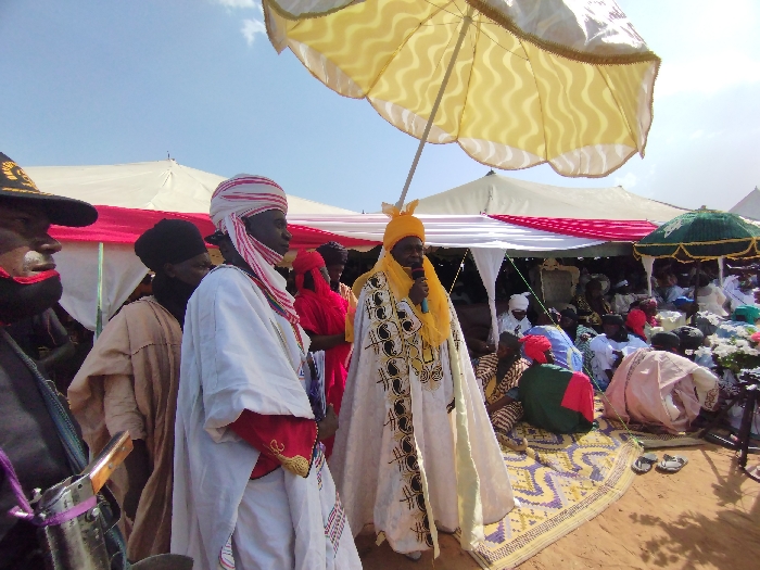 A gathering of people wearing traditional clothing takes place under a white canopy tent in a rural environment in Chum, Nigeria. The location is a small village, with a sandy soil and a backdrop of greenery. An individual wearing a white and gold robe with a yellow turban stands in front of a large crowd of people. He holds a microphone and speaks to the audience. The individual is standing under an umbrella, and is the main focus of the event. The other people are seated or standing and appear to be listening attentively. The event appears to be a religious or cultural ceremony.