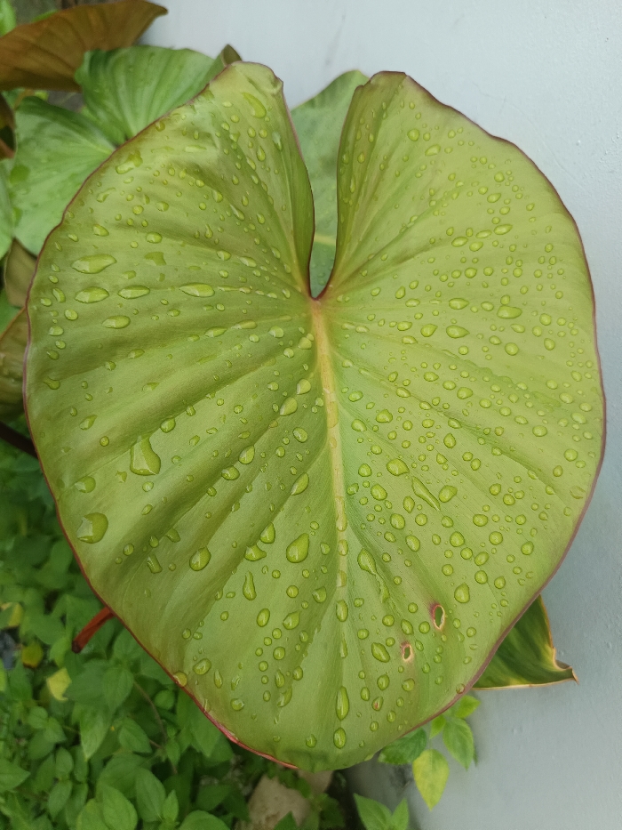 A large, heart-shaped green leaf dominates the frame, its surface covered in glistening water droplets. The leaf has a reddish-brown border and a central vein running from top to bottom. Smaller green plants are visible in the lower section, while a neutral-toned wall forms the background on the right. The leaf exhibits texture with subtle ridges and imperfections, including a small damaged area.