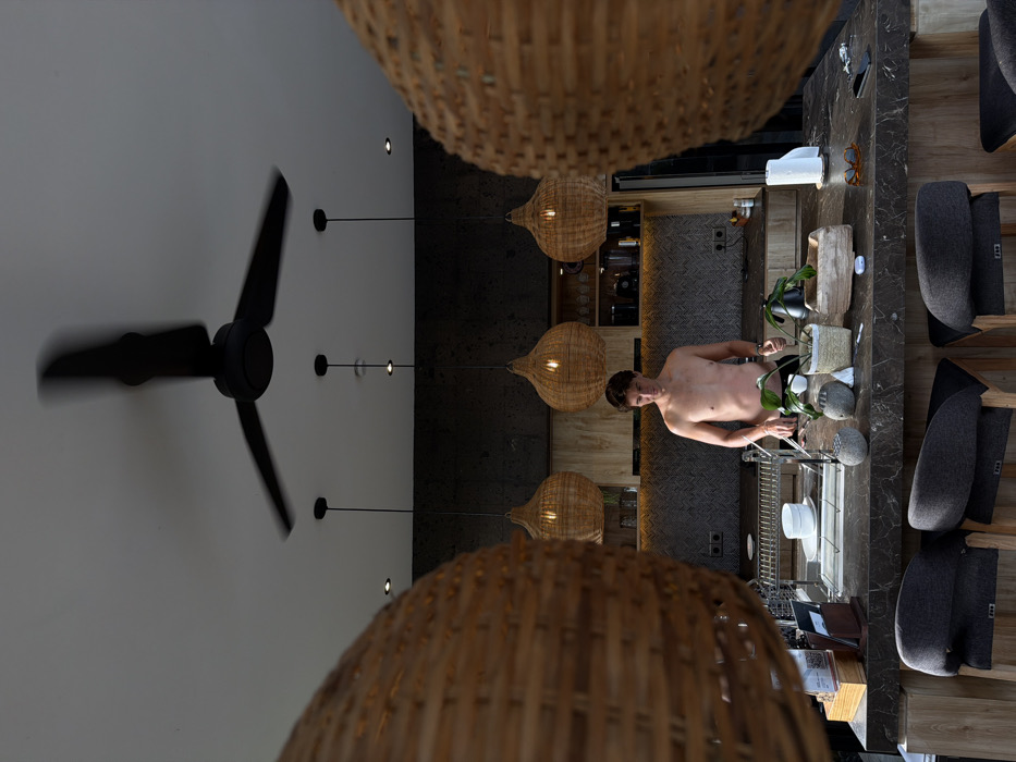 The image is an upside-down interior shot. Wicker light fixtures hang from the ceiling, framing a kitchen counter and a man with no shirt. The counter features plants, dishes, and accessories. Behind him, dark patterned tile walls frame wooden cabinets. A ceiling fan is visible on the left. Chairs line the right side. The lighting is dim but focuses on the man and the countertop.
