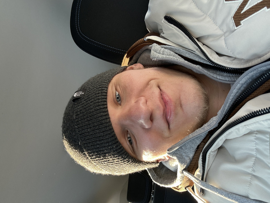 A close-up selfie captures a male individual with light skin, blue eyes, and light facial stubble, positioned inside a vehicle cabin