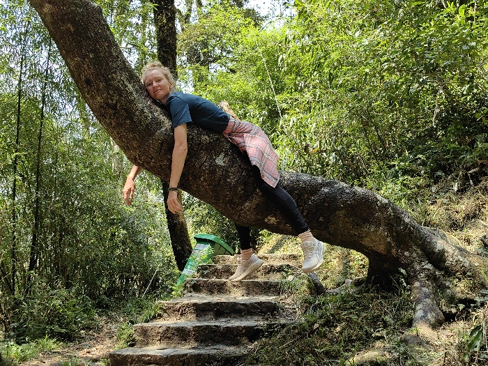 - "A fair-skinned female is depicted resting horizontally on a large, diagonally oriented tree trunk within a densely vegetated outdoor environment, likely a park or trail in an unspecified city in Vietnam" by FM-eUL7g1, licensed under CC BY 4.0