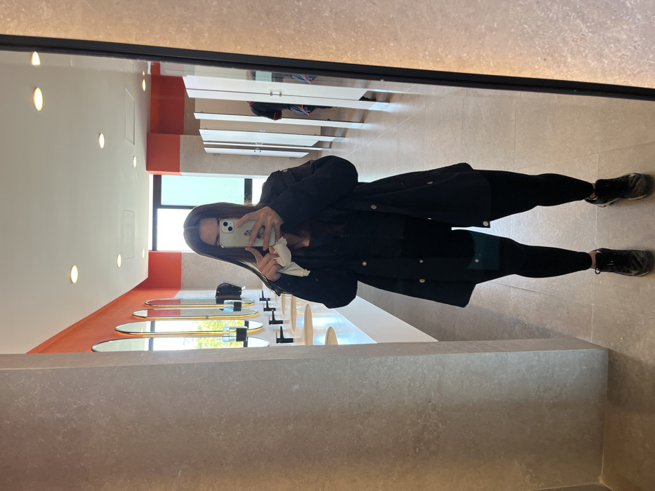 A woman stands in a bathroom, reflected in a large mirror. She is wearing a black jacket, black leggings, and dark sneakers. Her phone is in her hand, and she appears to be taking a picture of herself in the mirror. Behind her are several oval mirrors with gold trim, and white walls with orange accents and recessed lighting. The restroom also has stalls with metal dividers.