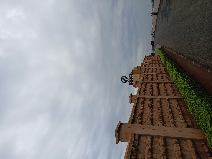 This image depicts an outdoor scene within Witeithie ward, Kenya, under a heavily overcast sky. A long, light brown, textured concrete wall with evenly spaced vertical pillars extends from the immediate foreground along the left side of the frame towards the mid-distance. A manicured green hedge runs parallel to the wall, bordering a dark grey paved road or pathway that stretches into the distance on the right, curving slightly. Above the wall, in the mid-ground, a sign for "ZILEH HOTELS" is visible, featuring a stylized "Z" in a shield logo. Further down the paved path on the right, near a low white barrier, several indistinct human figures are present. One figure on the far right, wearing a red top, is observed with both arms raised. No vehicles are visible on the road.