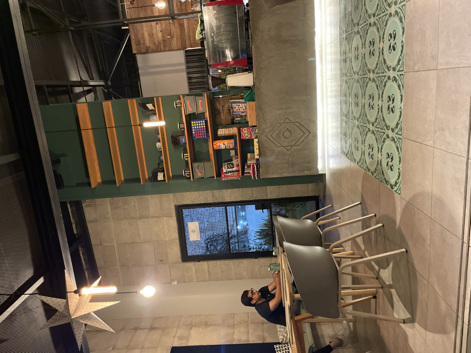 An eye-level, indoor shot showcases a cafe. A man sits at a table with gray chairs. Shelves display games and hats. A window is positioned above the table. A geometric star-shaped light fixture hangs from the ceiling. The floor has a tiled pattern of green and cream. The cafe's ceiling is high and industrial with exposed metal beams.