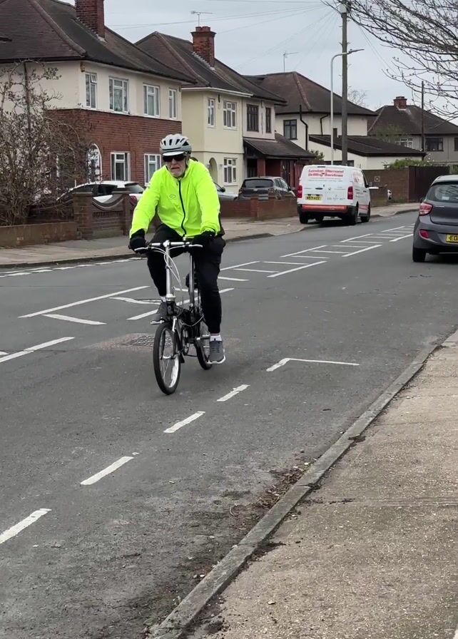 - "A person wearing a bright yellow jacket and a white helmet is riding a folding bicycle down a residential street" by FM-XMDnw2, licensed under CC BY 4.0