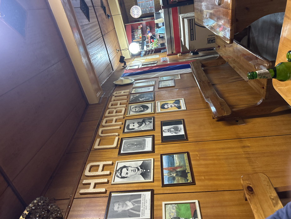 The image depicts the interior of a commercial establishment, likely a restaurant or tavern, situated in the city of Sushitsa, Bulgaria. The walls and ceiling are covered with light-toned varnished wood paneling. A prominent display on the left wall features a collection of framed portraits, primarily historical black and white photographs of men, alongside a few color paintings, including one with Cyrillic text identifying "Райна Попгеоргиева." Above these portraits, large, raised light-colored Cyrillic letters spell "НА СЛАВАТА" (TO THE GLORY). A vertically oriented Bulgarian flag (white, green, red stripes) hangs on the wall to the right of the portraits. Varnished wooden benches with backrests are positioned along the wall, accompanied by matching wooden tables. A green glass bottle rests on a table in the foreground right. In the background right, a bar area is visible, featuring a counter with red and silver accents, shelves stocked with bottles and glassware, a potted plant containing red flowers, and various light fixtures. A cardboard box labeled "PROFESSIONAL SOUND SYSTEM" is located on the floor near the bar. A partial view of a person's limb is visible in the far left foreground.