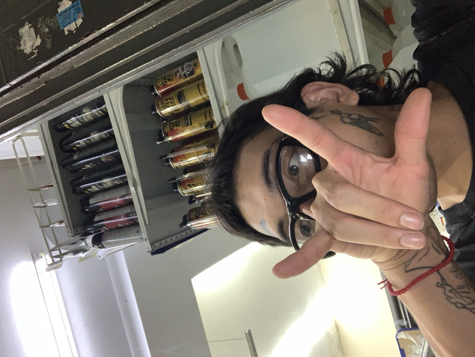 In Vicente López, Argentina, an indoor scene depicts a male subject from the chest up, positioned slightly off-center. The subject has dark hair, wears black-rimmed eyeglasses, and looks directly at the camera. Tattoos are visible on the subject: a small mark above the left eyebrow, a small design on the left cheek, and intricate script or imagery on the left forearm. A red string bracelet is worn on the left wrist. The subject's left hand is raised, performing a gesture with the thumb, index finger, and pinky extended, while the middle and ring fingers are bent. The subject is wearing a dark-colored t-shirt. The background reveals a commercial or storage environment. A grey metal shelving unit is prominently displayed behind the subject. The top shelf contains multiple dark-colored aerosol cans. The lower visible shelf holds rows of yellow, red, and black aerosol cans, some with "SUN" and "FLAME" branding partially visible. To the right of the subject, several large, translucent white plastic containers with orange caps are stacked. The ceiling is white, with a linear fluorescent light fixture visible in the upper left portion of the image. A dark, vertical structure with torn paper labels is visible along the far right edge of the frame.