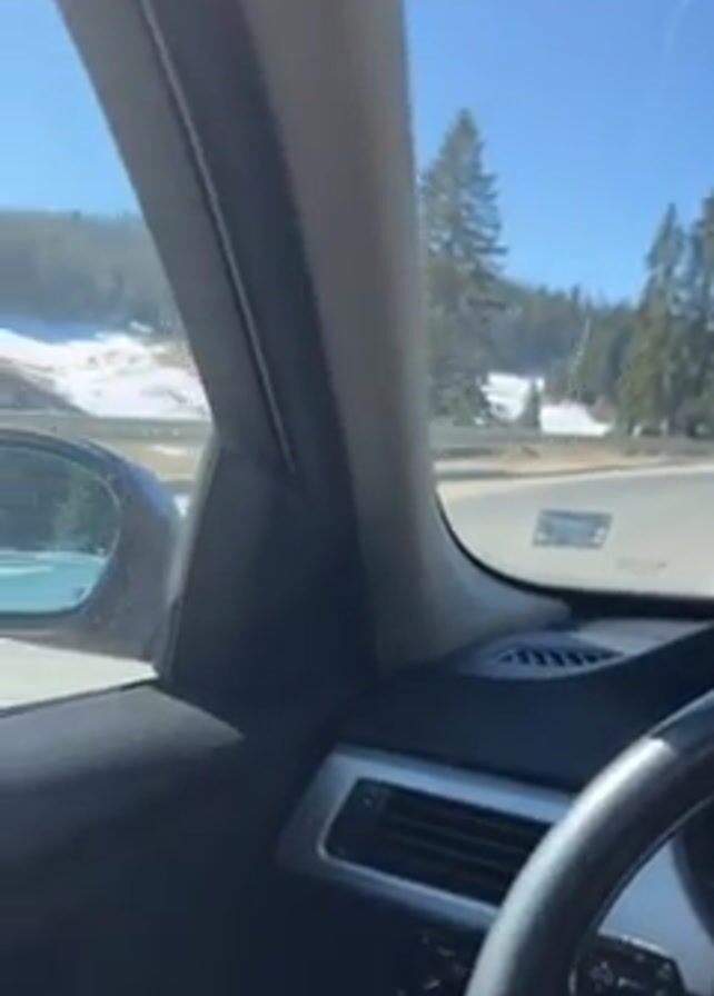 view from inside a car driving on a road on a sunny day. The road is bordered by a metal guardrail and a snow-covered landscape with trees. The camera pans to the left to show a Bulgarian flag waving in the wind next to the road. The interior of the car is visible, including the dashboard, steering wheel, and side mirror. The sky is clear and blue.