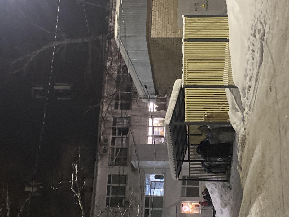 The image presents a nighttime winter scene in Chaikovsky, Russia. The ground is uniformly covered in snow, displaying vehicle tracks and foot impressions. In the foreground, a dark-framed, covered refuse enclosure with a snow-laden roof houses multiple dark-colored trash bins. This enclosure is adjoined on the right by a yellow slatted fence. Behind the enclosure, a multi-story building with a light-colored facade, featuring numerous windows, is visible. The lower-level windows are illuminated, indicating interior lighting; one window on the far left shows an orange glow. Several exterior air conditioning units are mounted on the building's facade. To the right of this building, a brick structure with a sloped corrugated metal roof is present. A utility panel, marked with "РУ 10" and a triangular hazard symbol, is attached to its exterior. Bare tree branches, some lightly covered in snow, extend across the scene against the dark night sky, where power lines are also visible. On the far left, near the ground floor of the main building, a small group of indistinct figures stands on a snowdrift near an illuminated window. No specific actions or interactions are clearly discernible.