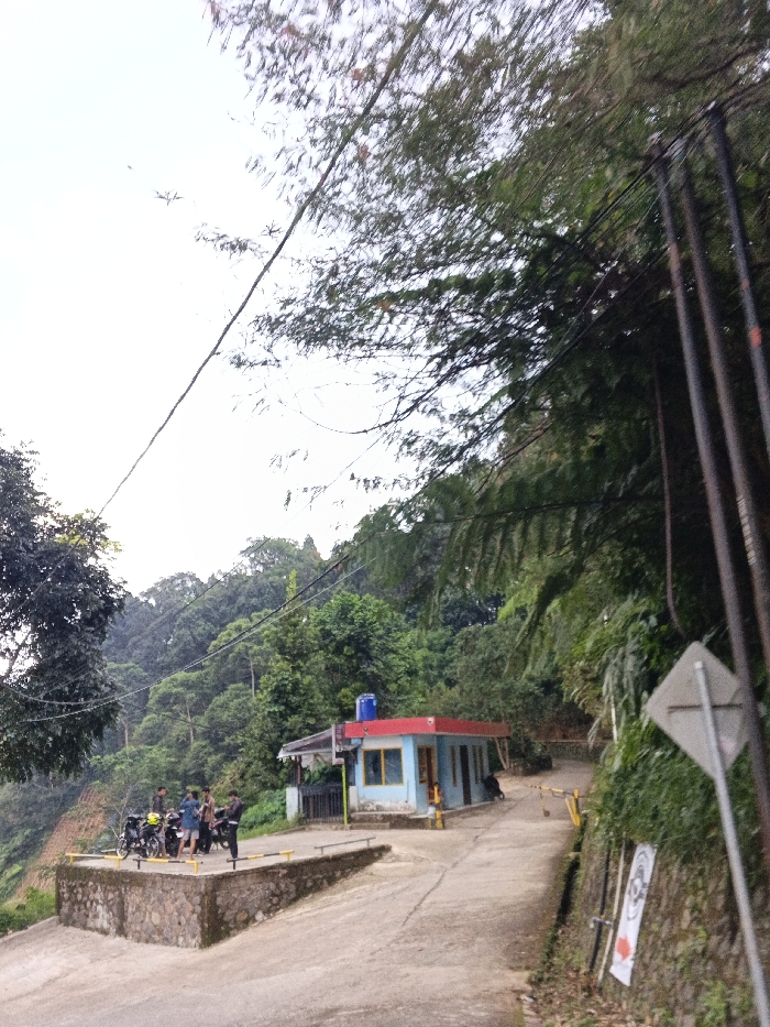 The image depicts a roadside scene in a mountainous and heavily forested area within Xiulin, Taiwan. The sky is overcast and bright. A light blue, single-story building with a prominent red roof and a blue water tank on top is situated on the right side of a paved road. Opposite this building, on the left, is an elevated, rectangular platform with a stone-faced base and yellow markings along its low perimeter wall. Approximately five to seven individuals are gathered on this platform, standing near at least three parked motorcycles. The paved road curves sharply to the right, continuing uphill past the building, and features yellow barriers or guardrails along its edges. Overhead power lines extend across the upper portion of the frame, descending towards the right side where they connect to visible utility poles. A partially obscured white road sign is mounted on the right bank, and a white banner or poster with black and red graphics is affixed to the retaining wall below it. Dense green foliage, comprising various trees and shrubs, covers the surrounding hillsides, with some branches overhanging the road from the right.