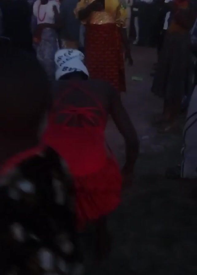 gathering of people, with a focus on a woman dancing. The woman is wearing a red dress with a fringed hem and a white headscarf. The other people are standing around, some are wearing traditional clothing. The environment looks like an outdoor space, possibly a courtyard or open field, with a dirt surface. The lighting suggests that it is either dusk or dawn. There are sounds of music and possibly some shouting in the background.