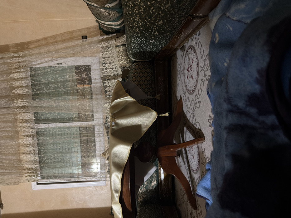 The image depicts an interior residential scene in Fez, Morocco. A white-framed, double-paned window with internal roller blinds is visible centrally against a light-toned, textured wall, partially covered by sheer, light-colored lace curtains featuring ornate patterns. In the mid-ground, a low, carved wooden table is positioned, draped with a golden, patterned tablecloth accented with tassels. Traditional Moroccan seating units, upholstered in dark green patterned fabric with ornate wooden bases, extend along the left wall and into the right foreground. These units include multiple cushions and bolster pillows. The floor is covered by a light-colored area rug with circular, decorative motifs in maroon and grey. A dark blue, textured textile occupies the immediate foreground. No individuals are present in the scene. The ambient lighting is dim, with an external light source faintly visible through the window.