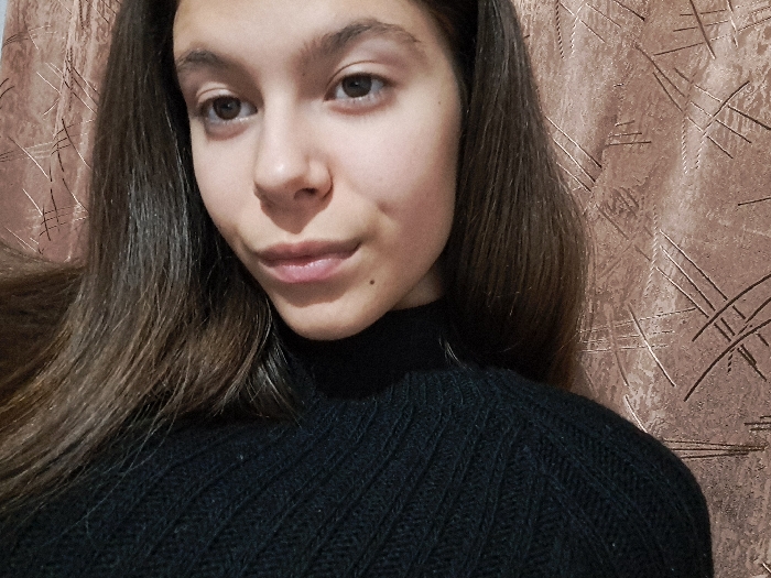A young adult female is depicted in a headshot-style portrait, positioned indoors in what is identified as the city of Varshets, Bulgaria