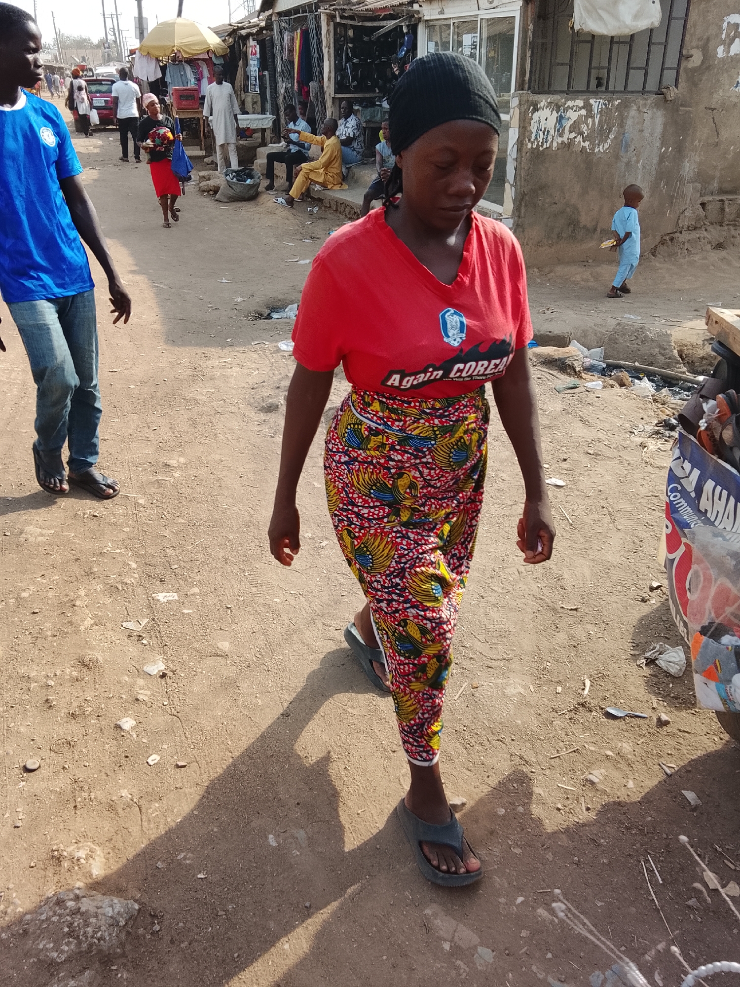 The image depicts a bustling informal street market or commercial area in a local district of Abuja, Nigeria, under bright daylight. In the foreground, a dark-skinned woman walks towards the viewer's left. She wears a black headwrap, a red short-sleeved t-shirt with a white logo and "Again COREA" printed text, and a vibrant red, yellow, and blue patterned wrapper (Ankara print) tied at her waist. Her gaze is directed downwards, and she wears dark flip-flops. To her left, partially obscured, is a dark-skinned man walking in the same direction, wearing a blue t-shirt with a white logo and blue jeans, also in dark flip-flops. The ground is an unpaved, light brown dirt surface, showing tire tracks and scattered debris including small rocks and pieces of paper or plastic. Shadows are cast from the left side of the frame. In the midground, towards the left, another woman in a red skirt and head covering carries an object and a blue bag. Further back, a red car is parked among other pedestrians. Towards the right midground, a young child in a light blue traditional tunic walks away from the camera. The background features a row of informal market stalls and single-story commercial structures. A prominent yellow sun umbrella provides shade over an area with displayed merchandise. Various individuals are present: some stand, others sit on a raised concrete platform. One man in a light yellow traditional outfit sits on this platform, while another in a white traditional outfit stands nearby. The buildings appear to be constructed from concrete or similar material, exhibiting signs of wear and basic finishes. Utility poles and wires are visible in the distant background. Along the right side of the frame, near the foreground woman, part of a blue and red container or vehicle panel with visible text fragments like "AHAM" and "Communic" is present, surrounded by refuse.