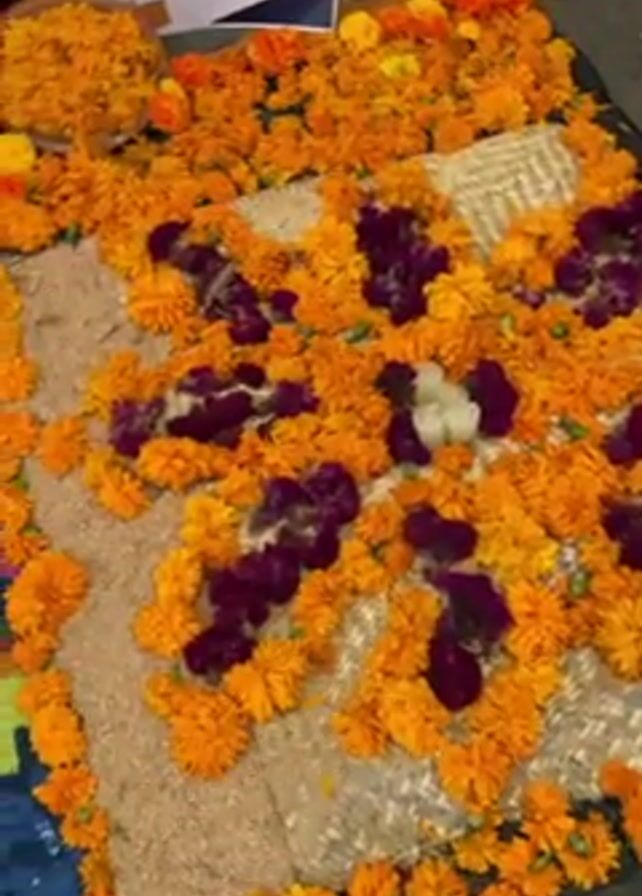 Day of the Dead altar display. There are colorful decorations made of flowers, including marigolds, as well as intricate designs made from sand or other materials. One design features a skeleton wearing a hat. A sign with the words "Alfred Binet" is visible, possibly indicating the institution or group that created the altar. There are also baskets filled with flowers and other decorative elements. The scene is festive and celebratory.