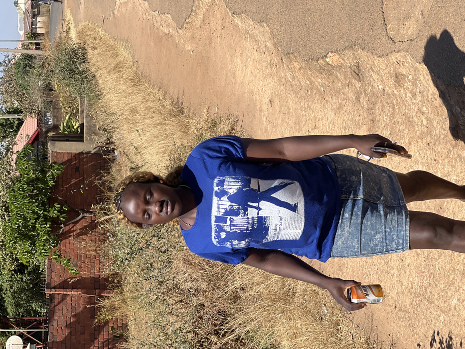 A dark-skinned woman with light-blonde braided hair and small white earbuds is depicted walking forward on a reddish-brown dirt path in Du, Nigeria. She wears a blue short-sleeved t-shirt with a white graphic print and a faded blue denim mini-skirt. In her left hand, she holds an orange and white Maltina can. In her right hand, she holds a smartphone with a dark case and a metallic ring accessory. Direct sunlight casts prominent shadows. To the left of the path, a red brick wall is partially obscured by green foliage and dry grass. A white satellite dish is visible above the wall. To the right of the path, a darker road and more dry, tall grass are visible. In the background, distant structures with red roofs and sparse vegetation are present under a clear sky.