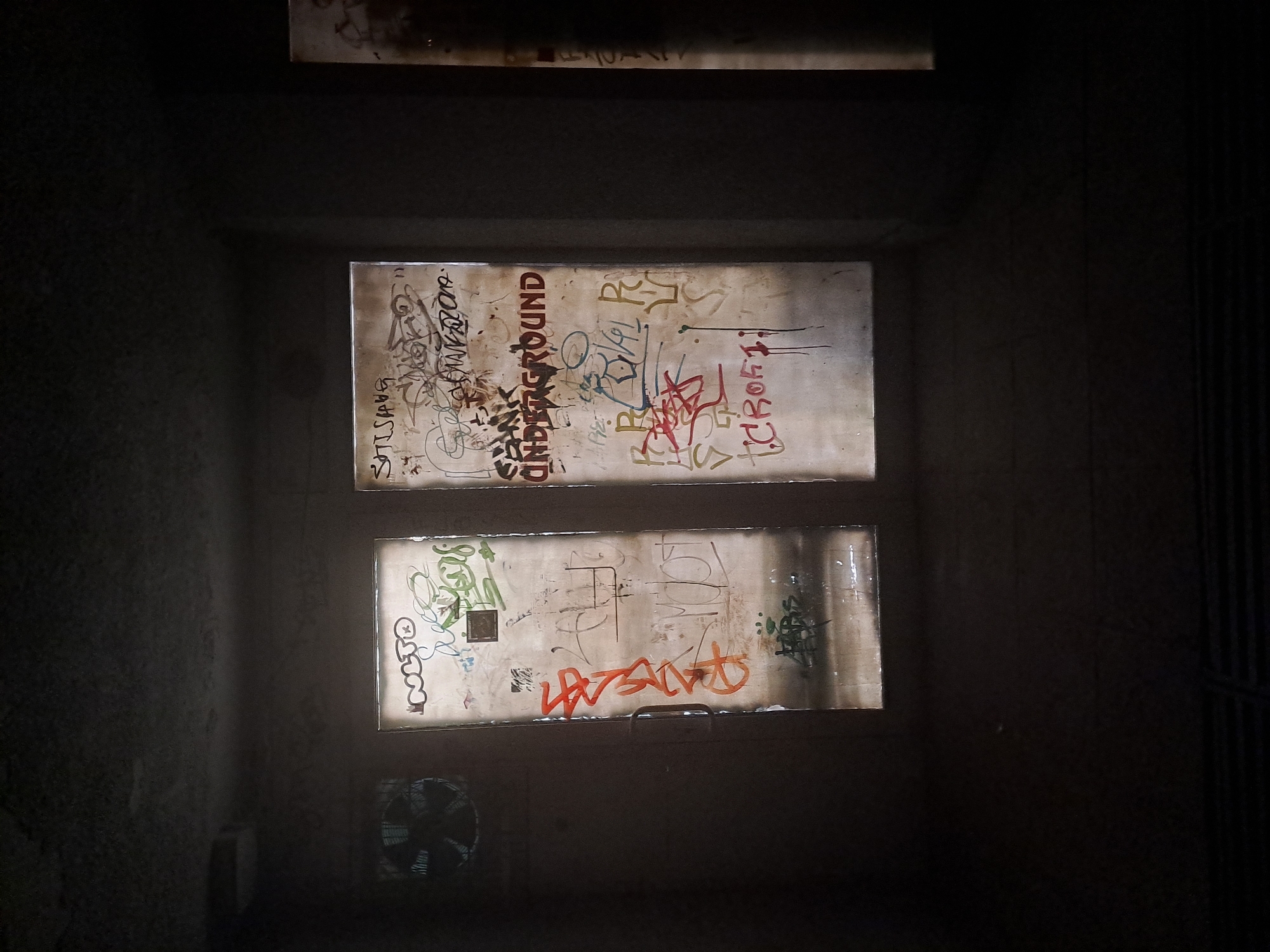- "An interior shot focuses on a rectangular window, divided into two panes, covered in graffiti, and set in a dark, presumably abandoned, room" by FM-WTdz72, licensed under CC BY 4.0