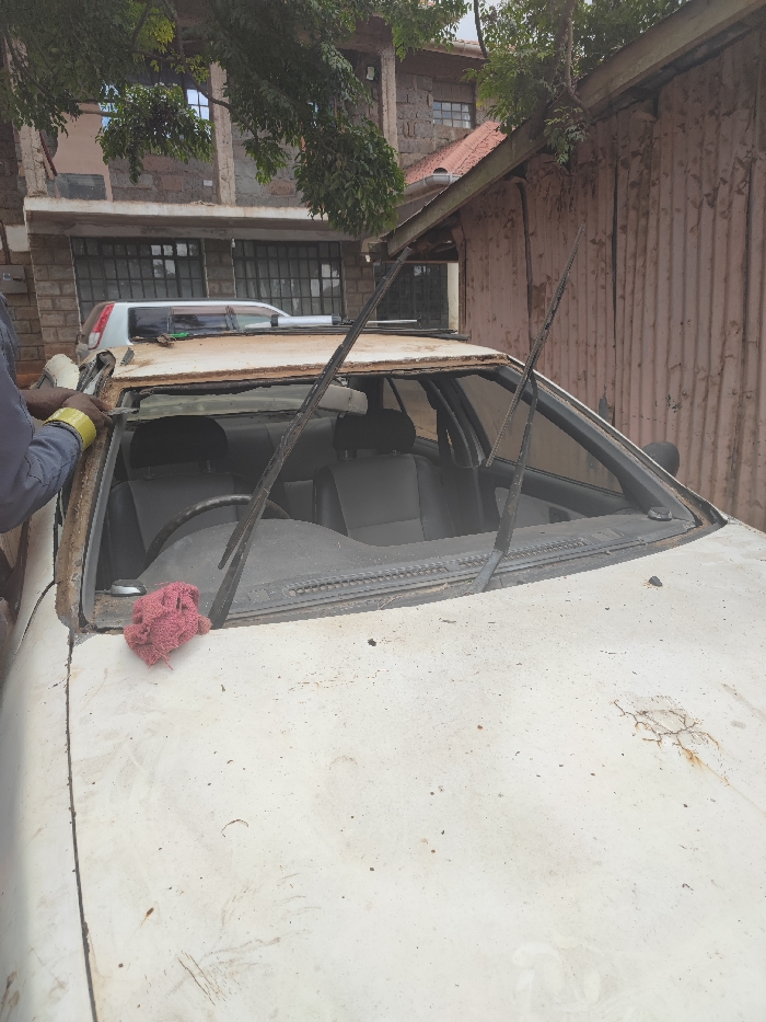 The image displays an outdoor scene in Ngong ward, Kenya, centered on a dilapidated, off-white sedan, likely a Toyota, with its windshield completely removed. The car's exterior paint is heavily faded and stained, with visible rust on the hood and around the empty windshield frame. The dashboard is visible and dusty, and the dark-upholstered front seats and steering wheel are partially discernible. Two windshield wiper arms are present but dislodged, resting on the cowl panel and hood. A crumpled, reddish-pink rag lies on the cowl panel near the driver's side. On the far left, the left arm and torso of an individual, wearing a blue long-sleeved garment and yellow gloves, are partially visible, indicating active work on the vehicle's driver-side roofline or A-pillar. The background features a light brown corrugated metal fence or wall on the right, partially overgrown by green tree foliage. To the left, a multi-story building constructed of rough-hewn stone or concrete blocks, featuring several dark-framed windows, is visible. Another white/silver vehicle is partially parked in front of this building. The scene is illuminated by natural daylight.
