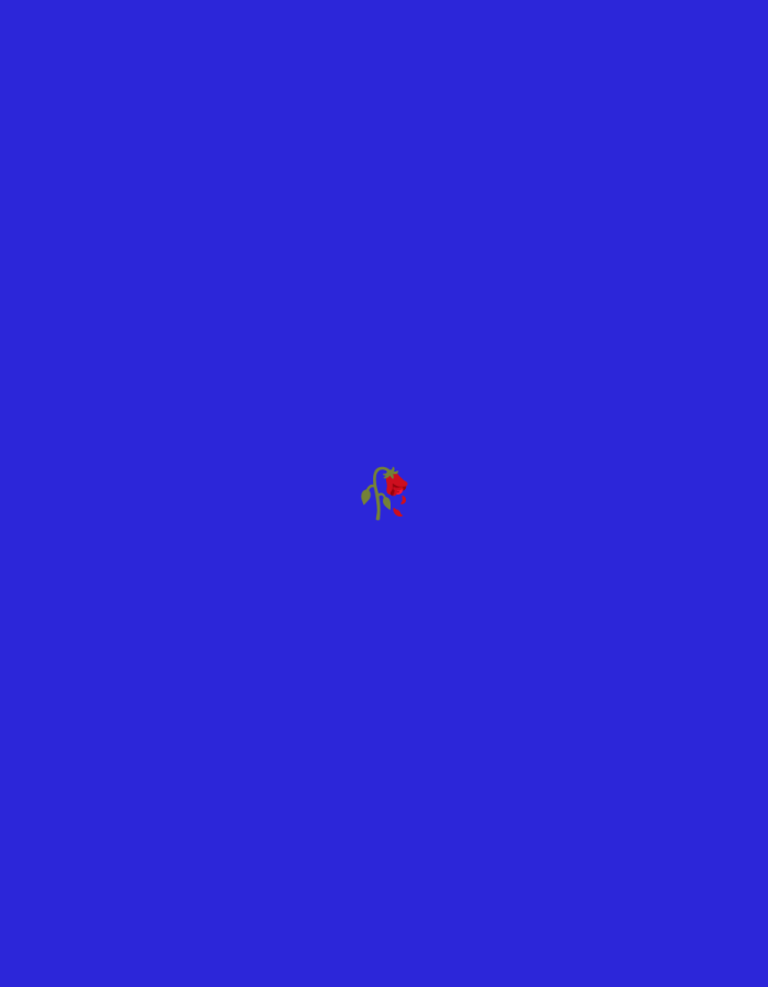 The image depicts an abstract composition on a solid royal blue field. Centered within the frame is a minimalistic illustration of a plant. This plant features a light green stem supporting a red floral element that appears to be drooping. The red element consists of several distinct, irregular shapes suggesting petals, some detached or fragmented from a central point. No human figures or other animate subjects are present. No specific actions or interactions are discernible. The depicted environment is an undifferentiated royal blue plane. The location is Unknown, Unknown.