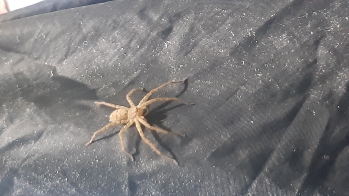 A light brown, eight-legged spider is prominently positioned on a dark gray, wrinkled fabric surface