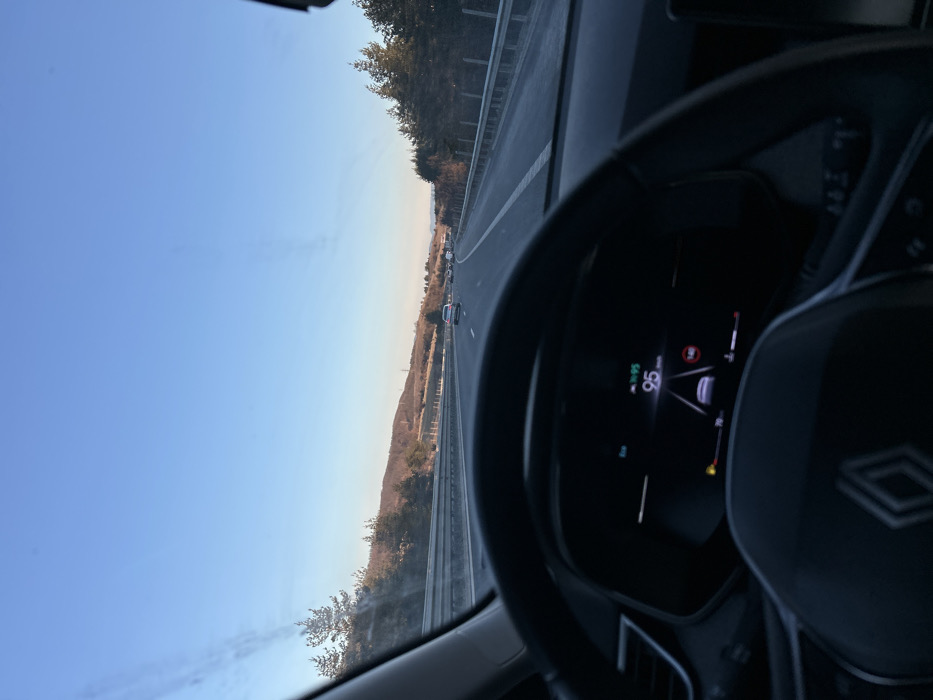 The image presents a first-person perspective from the driver's seat of a vehicle on a multi-lane highway, observed in the vicinity of Rajana, Bulgaria. The foreground reveals a dark-colored steering wheel with a Renault logo. Through the steering wheel, a digital dashboard displays a speed of 95 km/h, an "Eco" driving mode indicator, and a time of 14:05. An icon resembling a traffic sign with "140" is also visible on the digital display. The windshield exhibits minor streaks or dust. The highway ahead consists of at least two lanes of travel in the same direction, delineated by white lane markings. A metal guardrail parallels the right side of the road. Multiple other passenger vehicles are visible in the distance, proceeding in the same direction. The environment surrounding the highway features undulating hills covered in sparse, dry vegetation and scattered evergreen trees. The sky above is clear and bright blue, indicating daytime conditions.